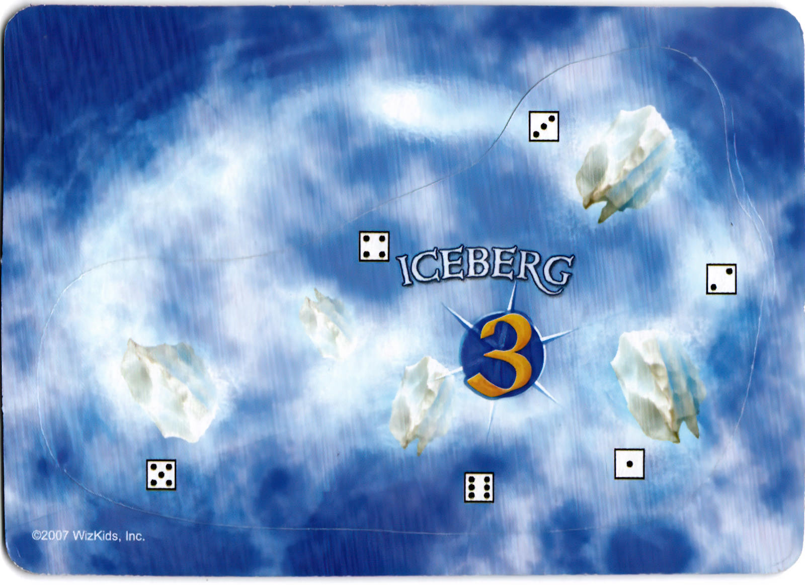 An iceberg has the numbers 1-6 printed around its edge, as well as a gold number printed at its center. At the beginning of each player's turn, before any actions are assigned, that player must roll a d6. Compare the result to the gold number printed on all icebergs in play. If the result matches any iceberg(s), those icebergs move that turn. For each iceberg that will move, roll another d6 and match the result to the number printed around the iceberg's edge. Measuring straight out from that number away from the iceberg, move the iceberg S. Do not turn or rotate it.