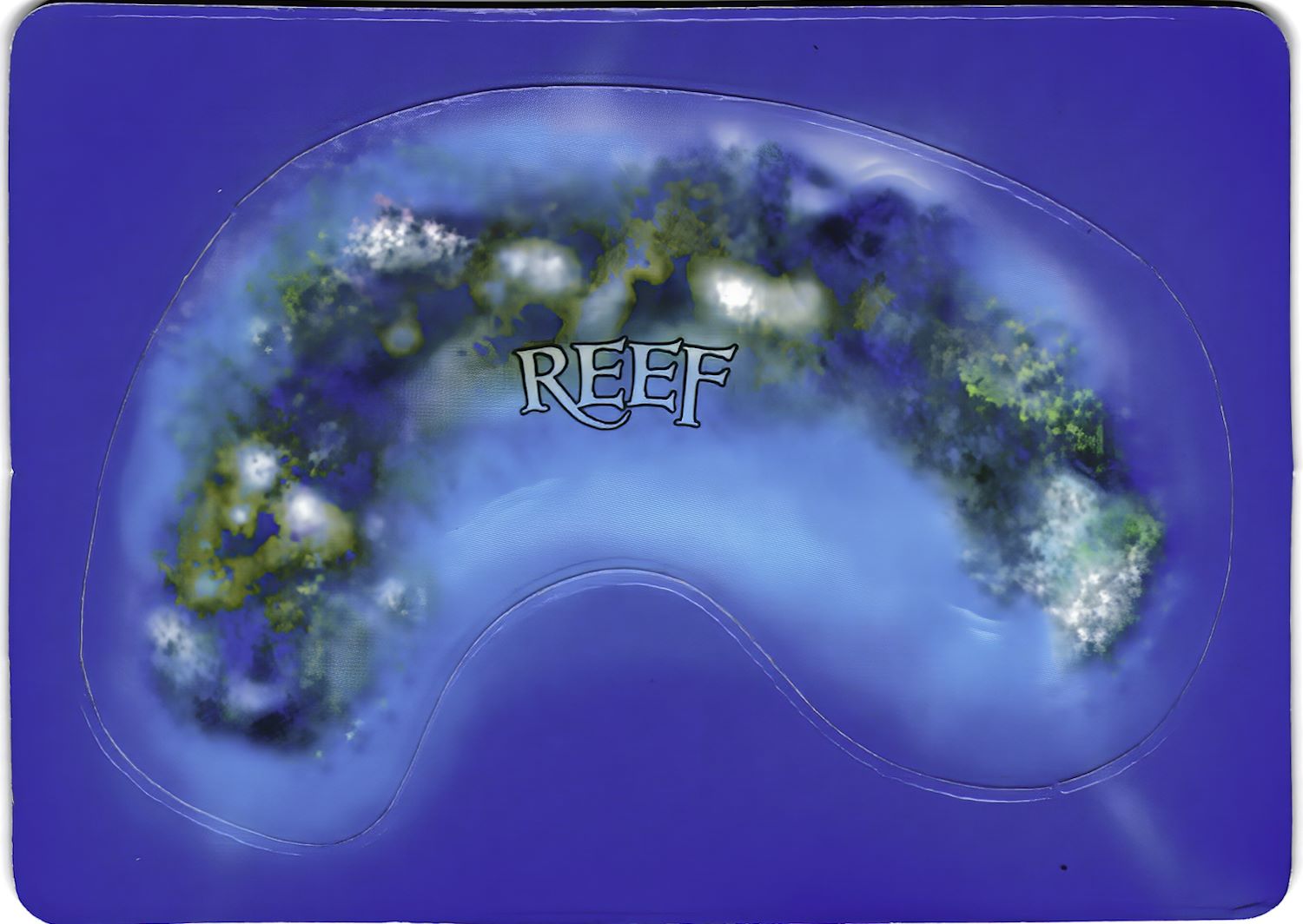 When any part of a ship or sea creature moves onto a reef, roll a d6. The result is the reef's rating until the end of that player's turn. Place the die result on the reef to remind you what the rating is. Compare the rating to how many masts or segments the game piece had when it was constructed. If the reef's rating is lower than this number of masts or segments, the game piece has a number of masts or segments eliminated equal to the difference.