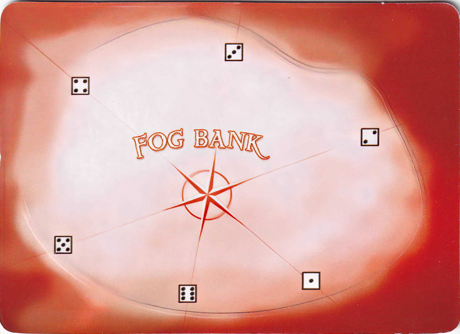 A fog bank has the numbers 1-6 printed around its edge. Fog banks block lines of fire. When any part of a ship or sea creature touches a fog bank, the entire game piece must be placed within the fog bank as a free action; the game piece's turn ends, even if it could move farther that turn.