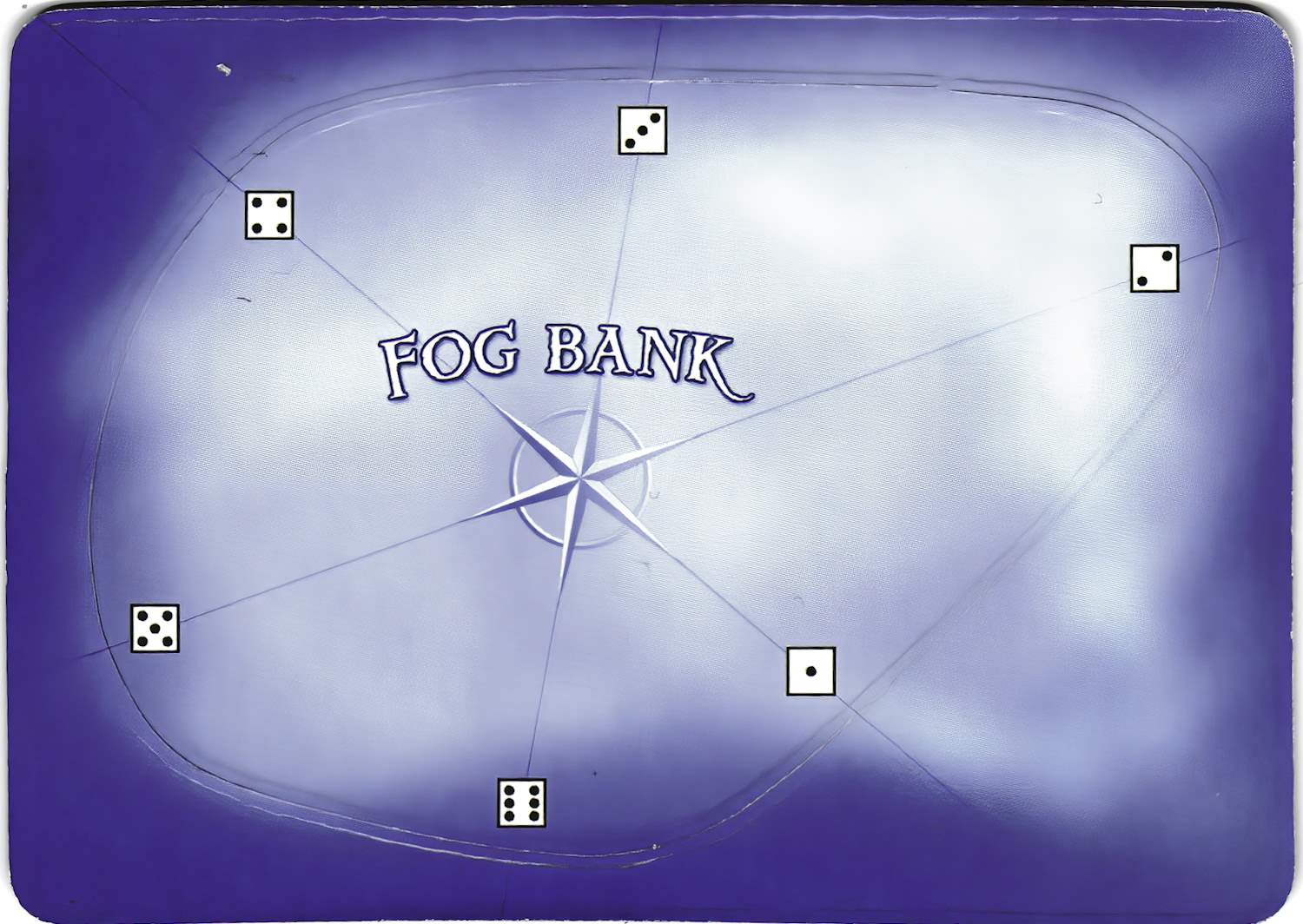 A fog bank has the numbers 1-6 printed around its edge. Fog banks block lines of fire. When any part of a ship or sea creature touches a fog bank, the entire game piece must be placed within the fog bank as a free action; the game piece's turn ends, even if it could move farther that turn.
