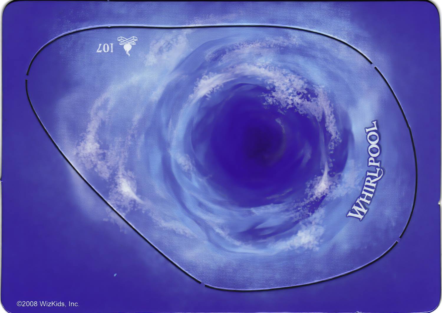 When any part of your ship or sea creature touches a whirlpool, you may choose to place it so that it touches any other whirlpool on the play area. If you do, roll a d6 after it is moved. On a result of 4-6, eliminate either one mast or segment, one treasure, or one crew from the game piece.