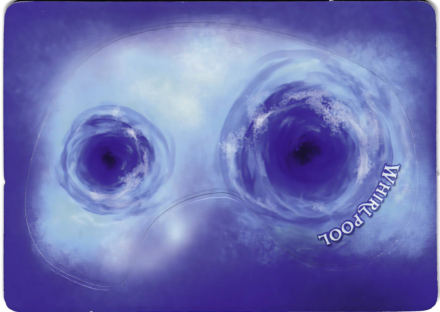When any part of your ship or sea creature touches a whirlpool, you may choose to place it so that it touches any other whirlpool on the play area. If you do, roll a d6 after it is moved. On a result of 4-6, eliminate either one mast or segment, one treasure, or one crew from the game piece.