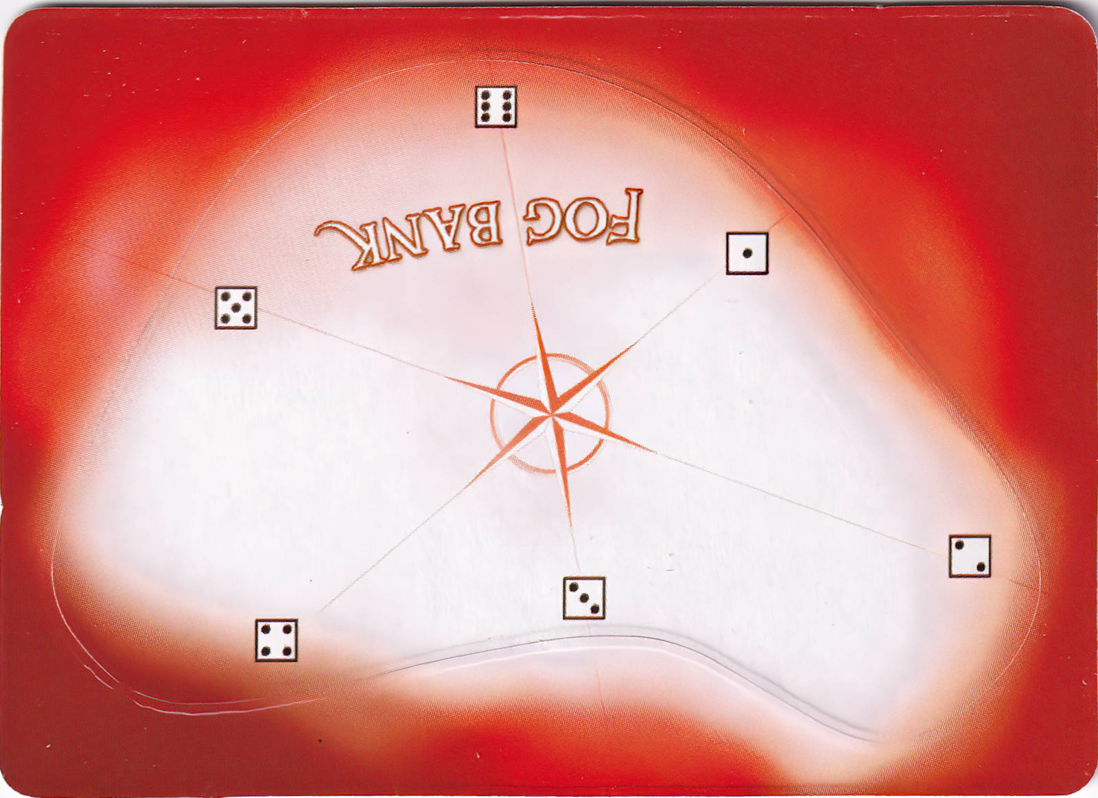 A fog bank has the numbers 1-6 printed around its edge. Fog banks block lines of fire. When any part of a ship or sea creature touches a fog bank, the entire game piece must be placed within the fog bank as a free action; the game piece's turn ends, even if it could move farther that turn.